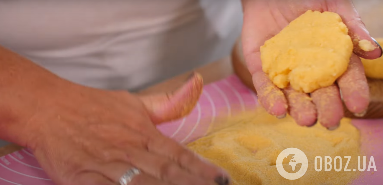 5. Чтобы тесто лучше лепилось и не прилипало к рукам, дополнительно используем кукурузную муку.