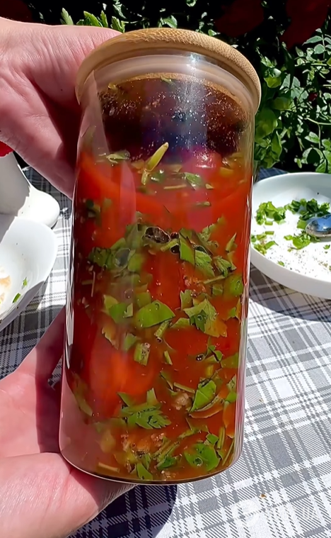 6. В банку выложить слоями зелень и помидоры, залить водой с томатом.