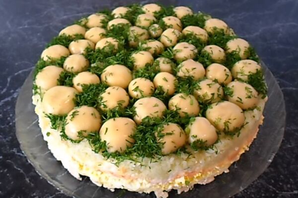Не представляете своего рациона и даже жизнь без грибов? Часто употребляете этот продукт в любом виде? Балуете себя и своих родных разнообразными блюдами с жареными или маринованными грибами? Хотите узнать максимально много уникальных рецептов с использованием любых грибов? Тогда рецепт салата, который мы будем сегодня готовить точно вам понравится. Ведь мы вас сегодня хотим порадовать салатом «Грибная поляна». Он выходит очень сытным, ароматным и невероятно красивым. Благодаря этому он с легкостью сможет стать украшением любого праздничного стола. Кроме маринованных грибов нам еще понадобится копченое куриное мясо, соленые огурцы, зелень, сыр, вареный картофель, морковь и яйца, а также заправка в виде майонеза. Приготовьте его на праздничный стол и салат превзойдет все ваши ожидания.
