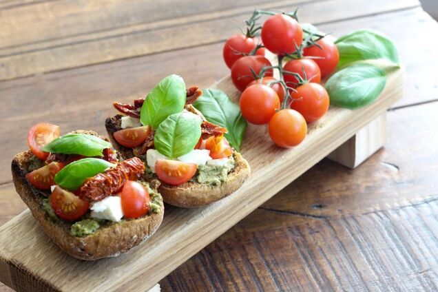 Зі звичайного магазинного багета можна зробити дуже вишукану святкову закуску. Для неї вам знадобляться соус песто, трохи овочів та сиру. Для довершеного смаку смачно використати густий бальзамічний оцет.